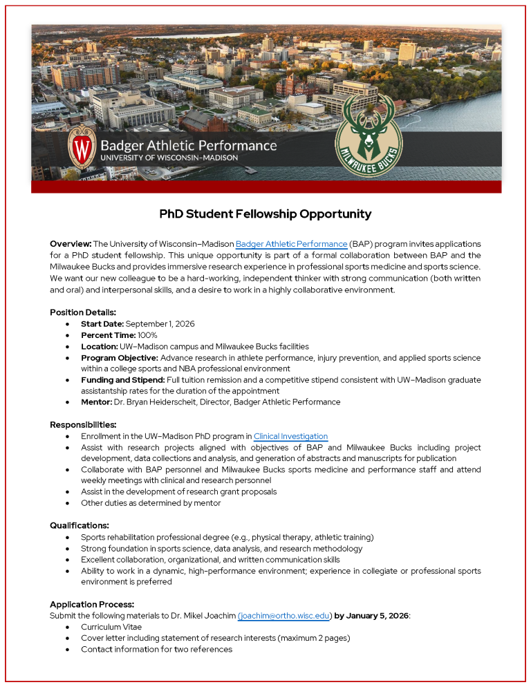 If you are not currently a UW-Madison student but interested in working with our lab to fulfill degree requirements, research fellowships, or similar experiences, please email a summary of your experience requirements (if applicable), specifically why you are interested in working with Badger Athletic Performance, and a copy of your resume (2 pages max) to bap@ortho.wisc.edu.
